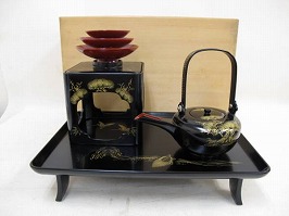伝統的な漆芸「能登輪島塗」によって装飾された 御屠蘇器揃です。 黒く美しい艶のある輪島塗の盃や盆などには、 沈金で亀や鯉、白鳥、松など縁起の良い物が描かれていました。